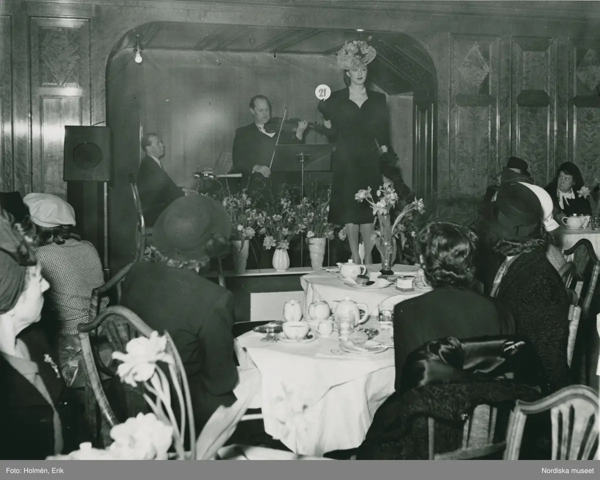 Hattmodevisning av Monsieur Erik på Nordiska Kompaniet. Modell i hatt, mörk klänning och handskar. Orkester i bakgrunden och publik i förgrunden.