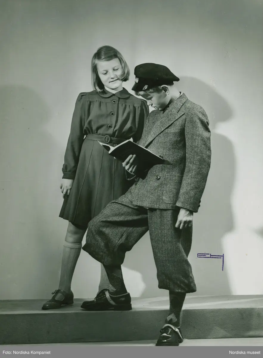 Skolungdom. En pojke i kavaj och äppelknyckarbyxor, skärmmössa, strumpor och snörskor, håller i en bok. Flicka i klänning, knästrumpor och sandaler, tittar i boken.
