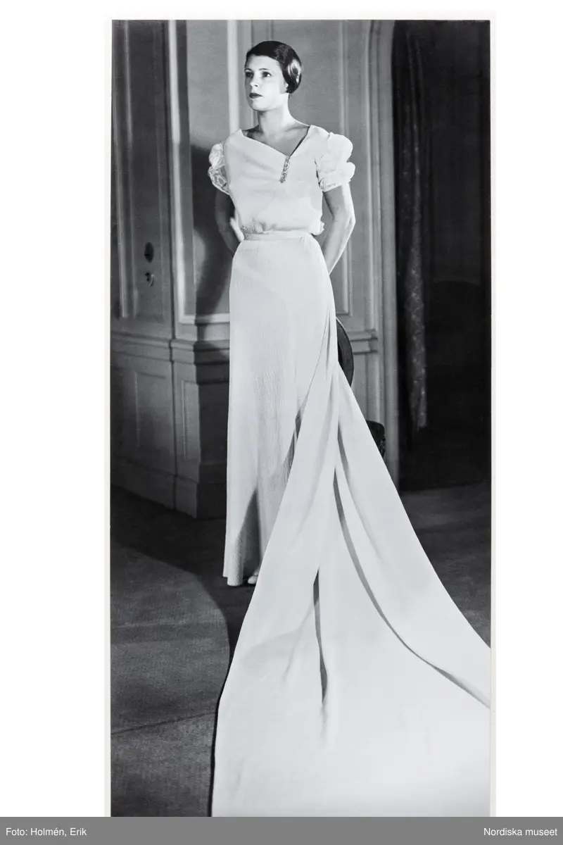 Mannekäng visar galaklänning, troligen hovdräkt, med kort gallerärm, snedskuren urringning med liten knappslå, markerad midja. Hellång kjol och långt släp. NK:s Franska damskrädderi.