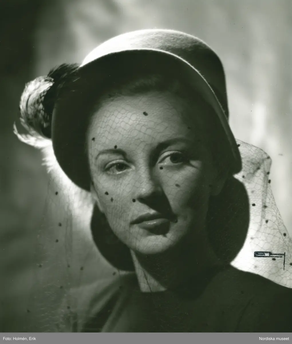 Porträtt av kvinna, möjligen modellen Hjördis Grundel-Starenius i hatt med fjäder och flor med moucher.