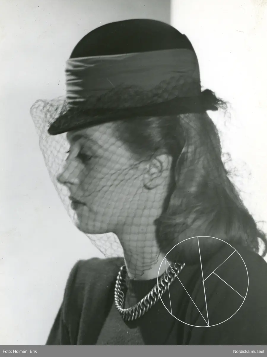 Porträtt av kvinna i hatt med brett hattband och flor, samt halsband.