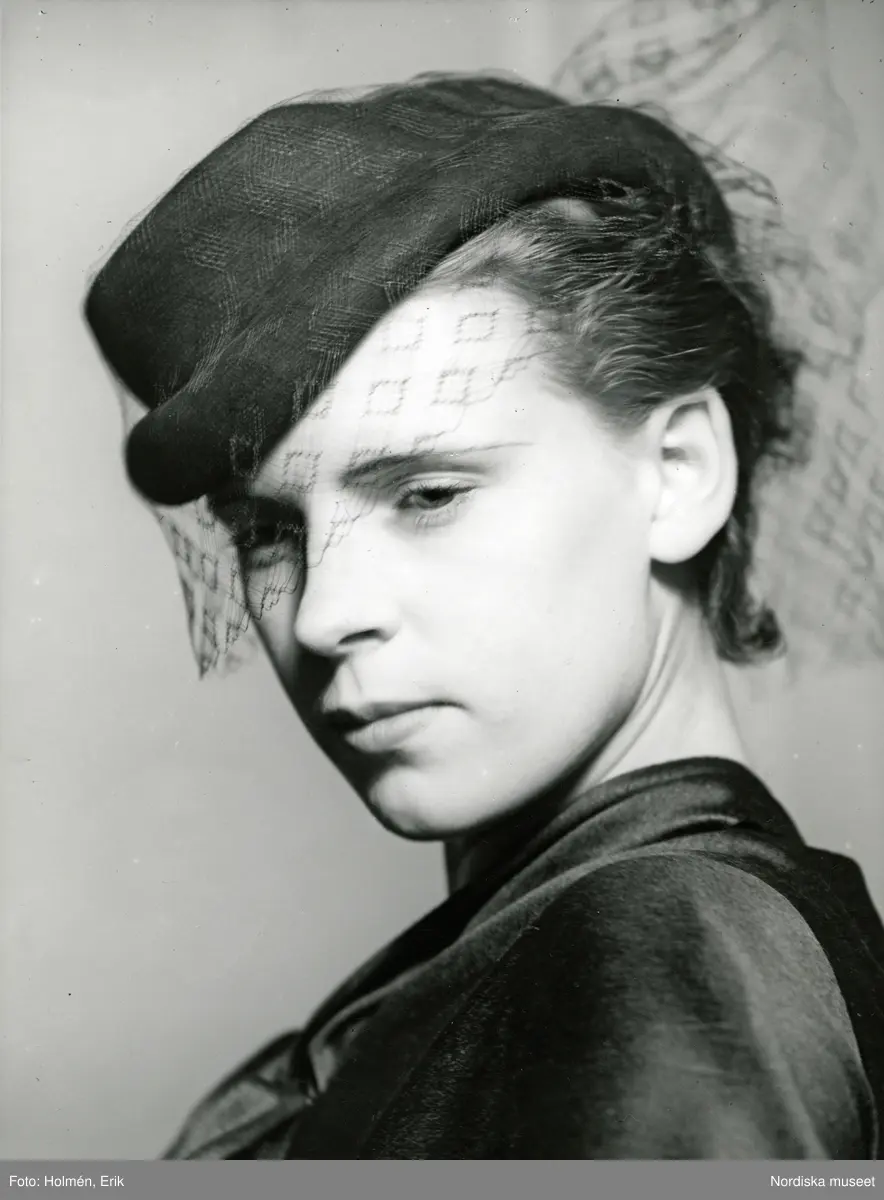 Kvinnlig modell med svart filthatt med flor. Nordiska Kompaniet, Stockholm.