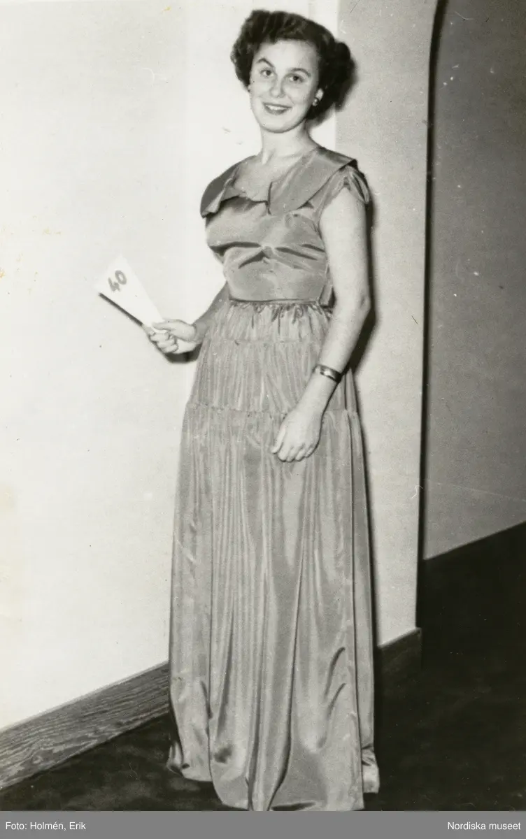 Nordiska Kompaniet. Tonårsmode 1950. Kvinna i ljus aftonklänning.