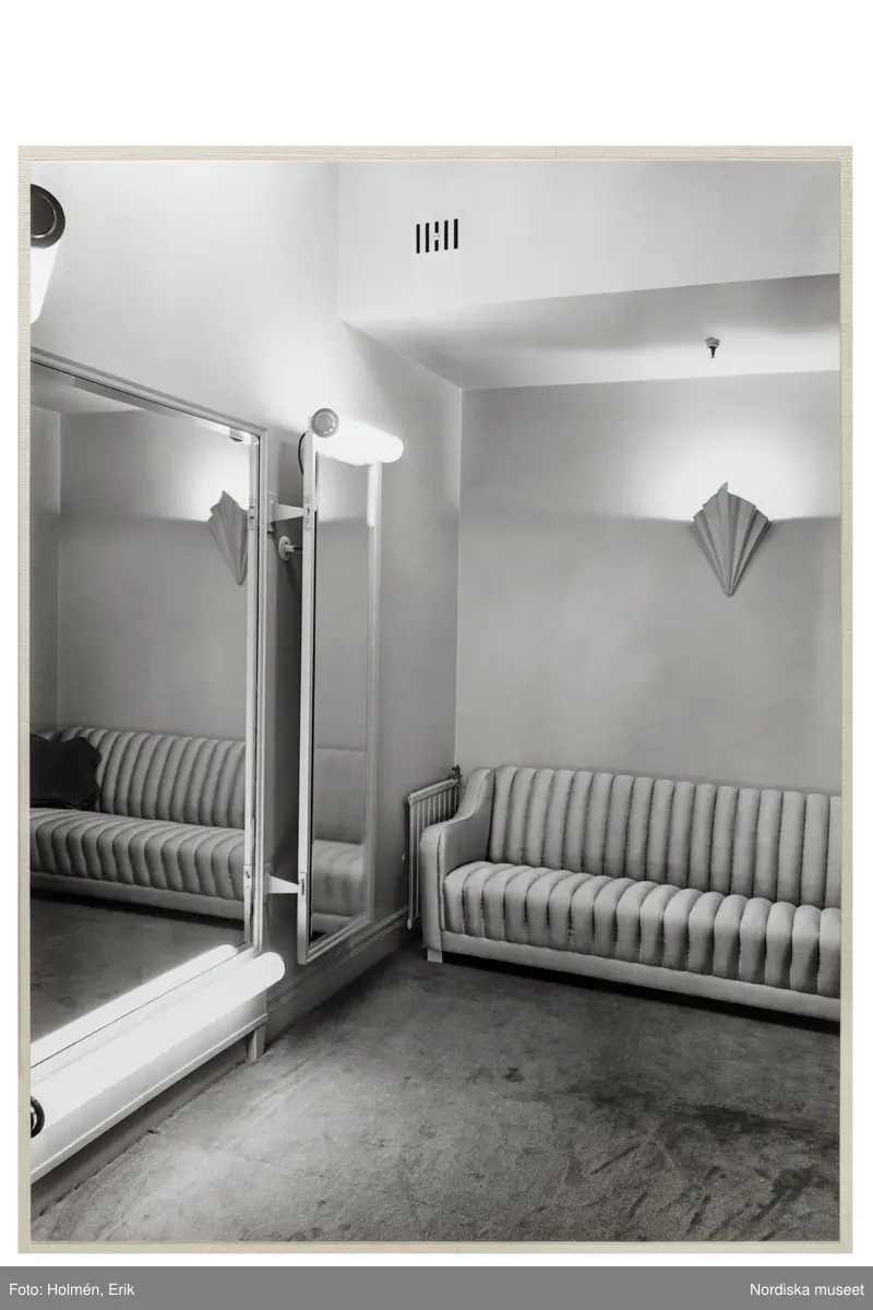 Interiör från Franska avdelningen på varuhuset NK, Nordiska Kompaniet, i Stockholm. Utmed väggen i rummet står en stoppad soffa. På väggen i vinkel höga speglar med lysrörsbelysning. Heltäckningsmatta. Salongen på plan fem uppdaterades 1939 i luxuös stil med klassicistiska inslag signerad NK:s stilbildande inredningsarkitekt Svend A Thoresen. Den pärlgrå signaturkulören som introducerades 1926 omsluter nu hela rummet.