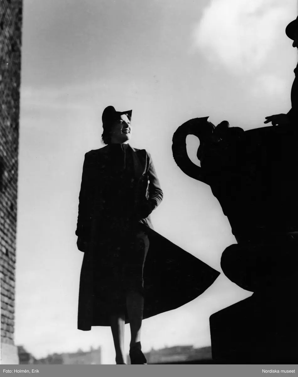 Modell klädd i öppen kappa, handskar och hatt. Knälång kjol och tröja under kappan. Bär handväska under armen. I högra hörnet skymtar en person klädd i hatt med cigarett i handen. Miljö: stadshuskajen i Stockholm.