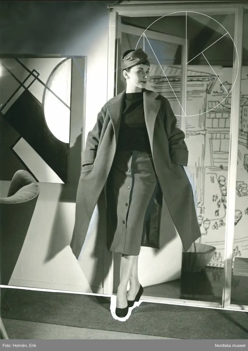 Modell visar höstkollektion, klädd i kappa, hatt, tröja, pennkjol och pumps, står framför konstverk.