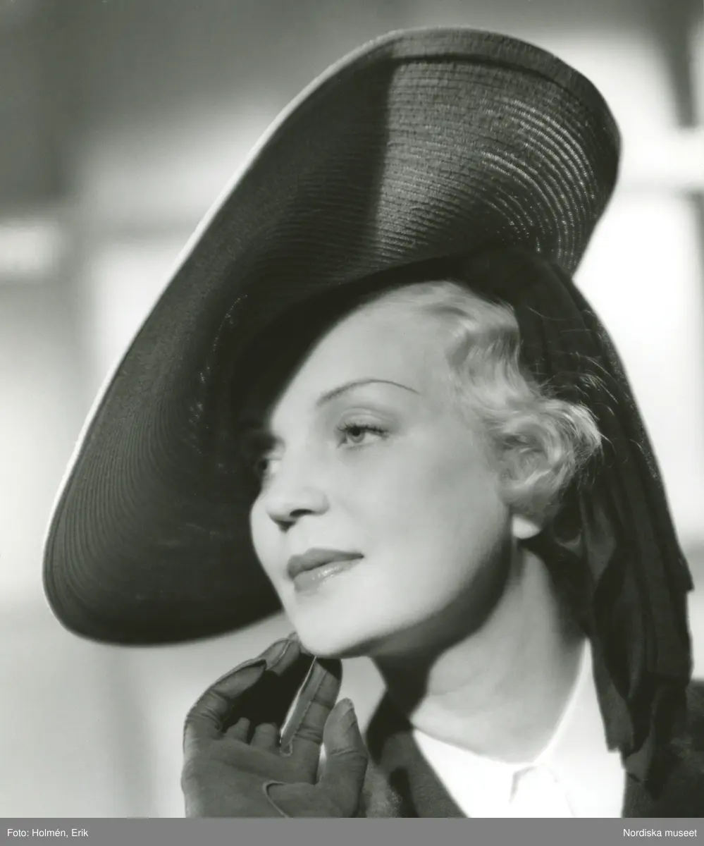 Porträtt av kvinna i bredbrättad hatt av Edward Molyneux.