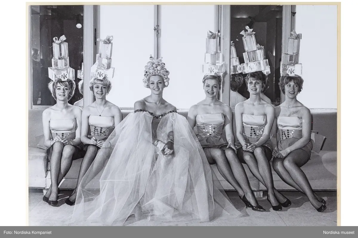 Operamaskeraden. Sex kvinnor sitter på soffa i provrum på varuhuset Nordiska Kompaniet. De är klädda i dräkter med NK i paljetter på liven och hattar i form av paket med NK. Kvinnan i mitten bär peruk av kulor.