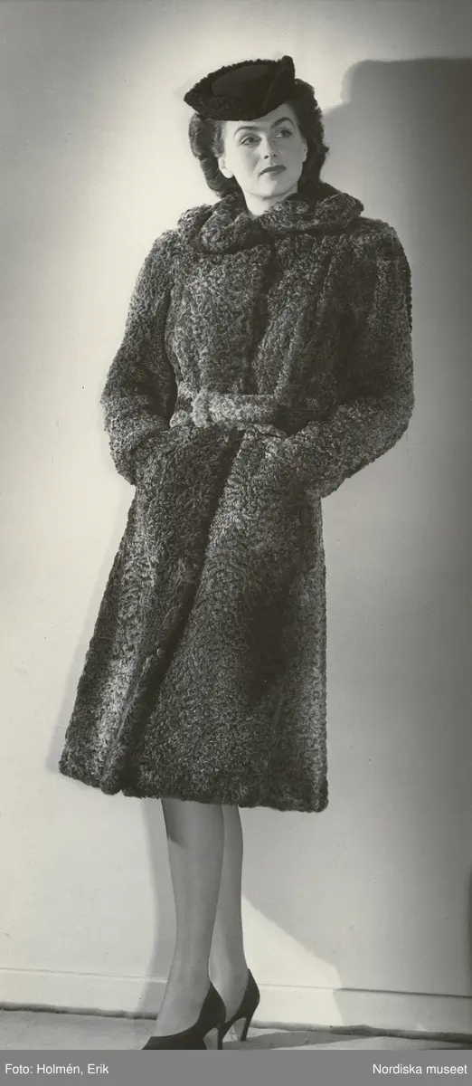 Nordiska Kompaniet. Kvinna i melerad pälskappa med skärp. Trekantig, mörk hatt.