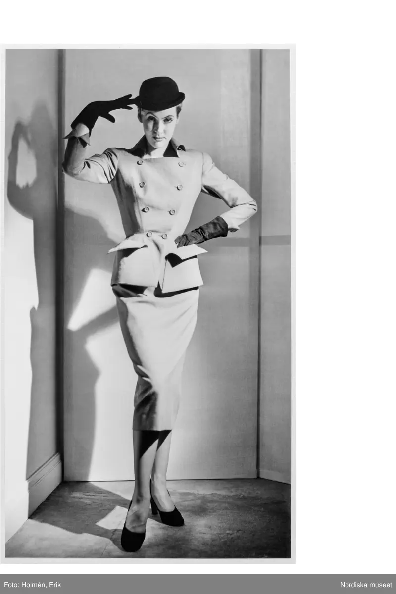 Mannekäng poserar iklädd dräkt i provrummet på NK:s Franska damskrädderi. Figursydd dräktjacka, stusslång med liten krage, dubbelknäppt och stora utanpåfickor med lock. Vadlång pennkjol. Hatt, handskar och pumps.