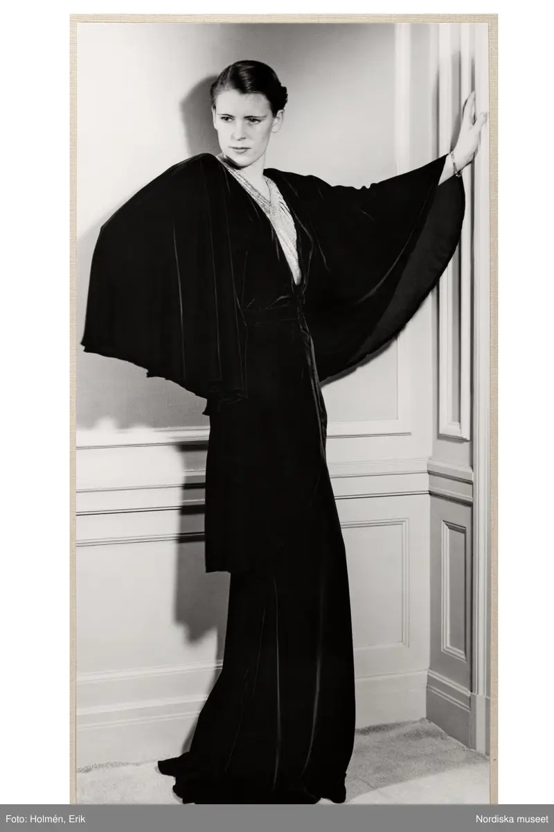 Mannekäng visar aftonklänning. Sammetsklänning med lång, mycket vid ärm, livet med infälld kil av avvikande tyg, skört och hellång kjol. NK:s Franska damskrädderi hösten 1935.