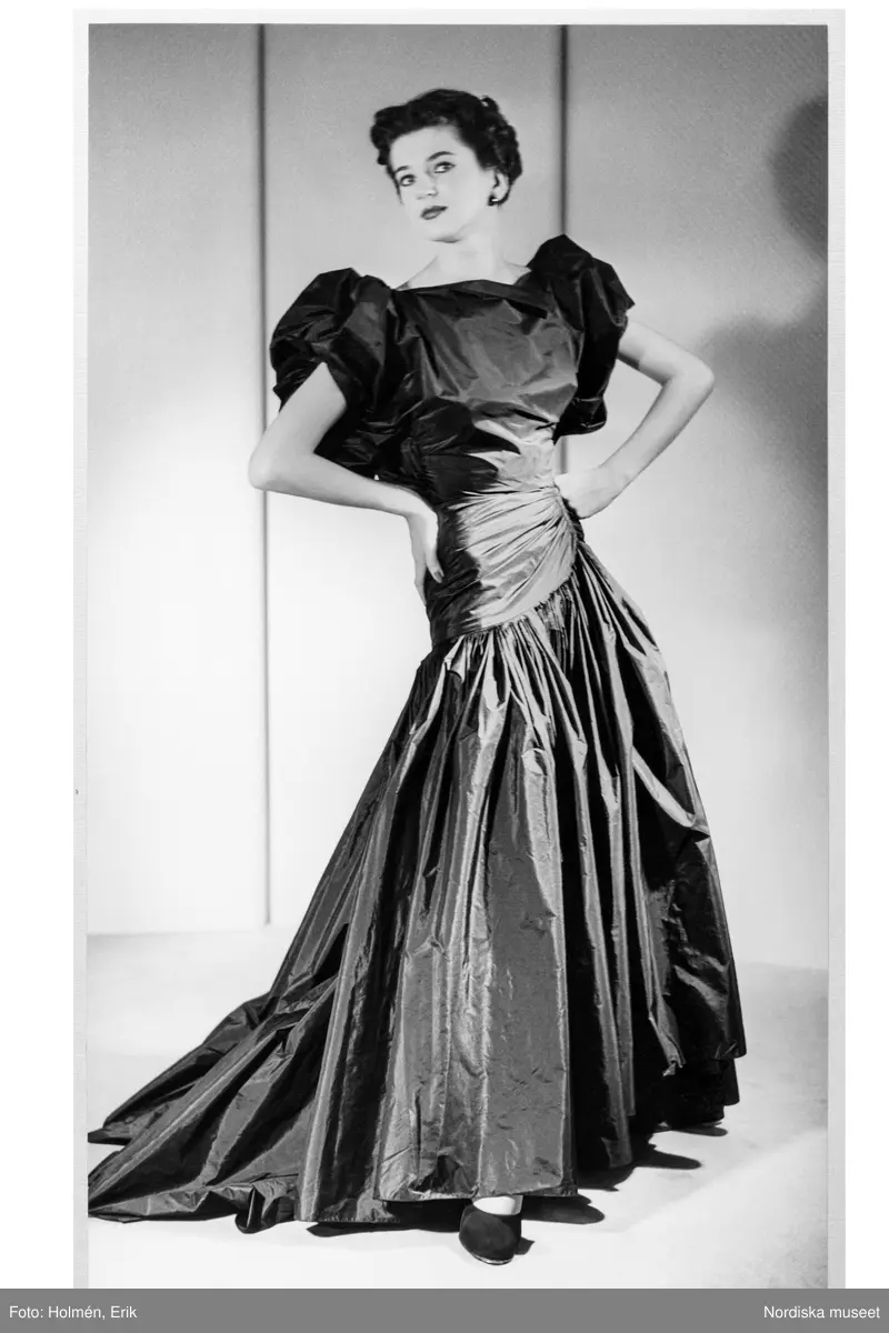 Mannekäng visar festplagg på NK:s Franska damskrädderi. Klänning av sidentaft med båtringning och kort puffärm med mycket volym, vid höftpartiet åtsmitande och med rynkad effekt. Vid hellång kjol med litet släp.