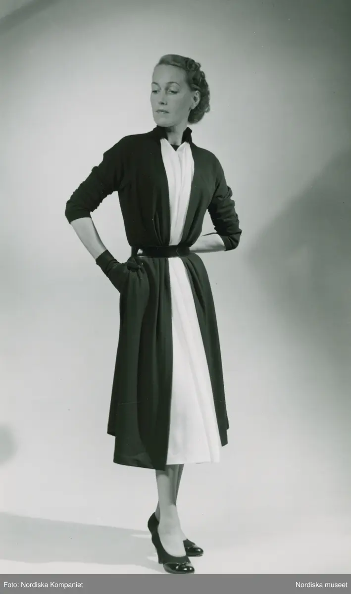 EM Modellbutik, modell i tvåfärgad klänning med skärp, handskar och pumps.