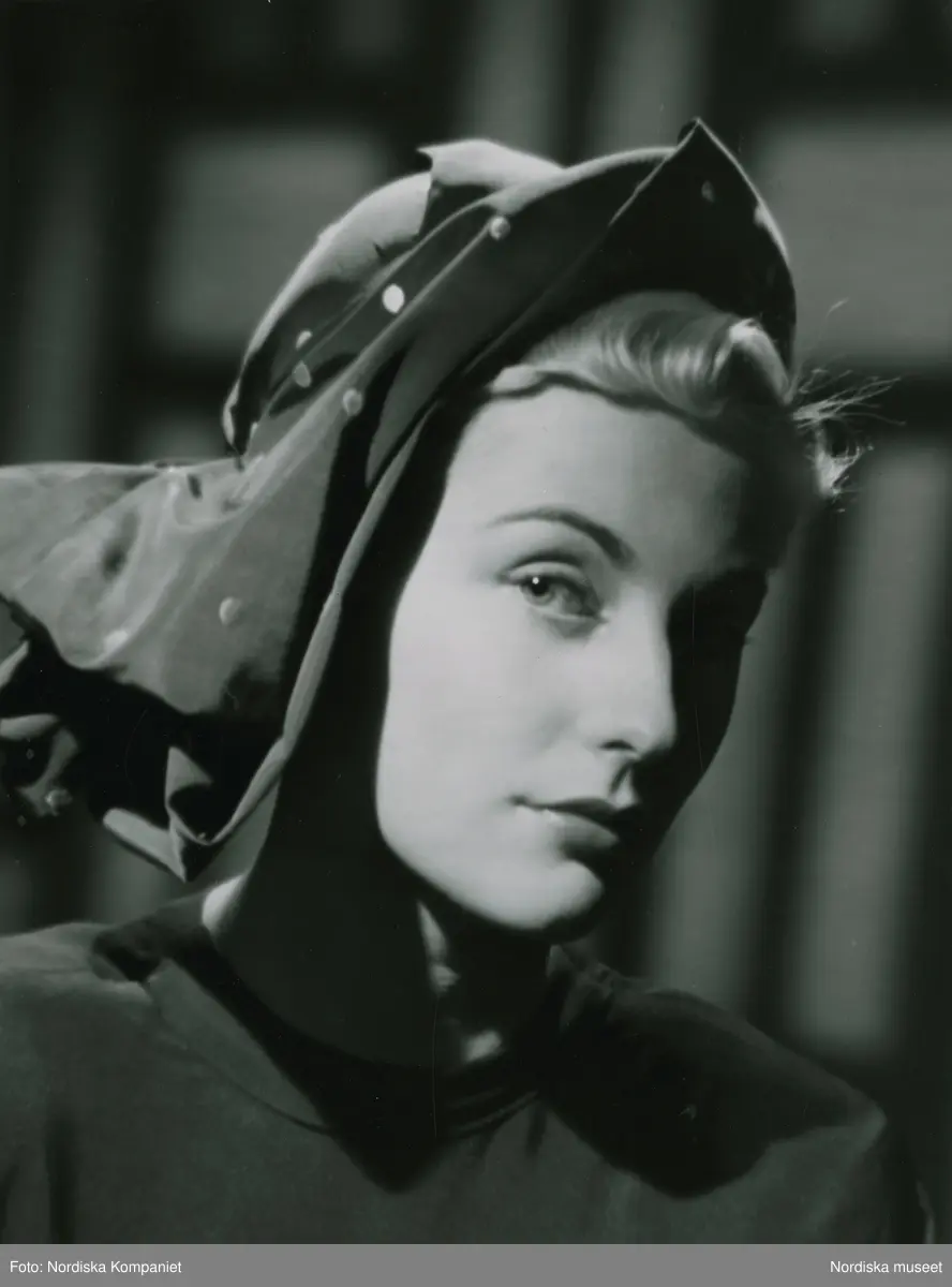 Porträtt av modell i hatt sydd av ljust marinblått failleband med vita påstickade prickor. Av Claude S:t Cyr.