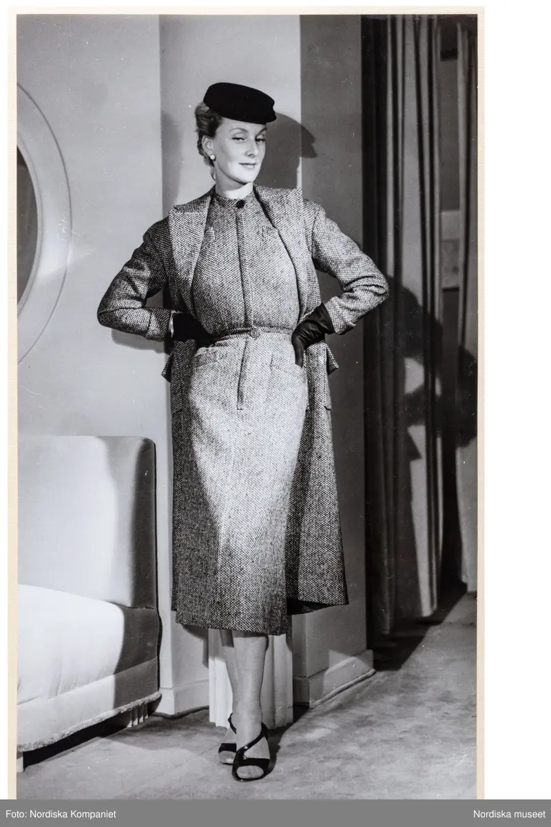 Mannekängen Margareta Berglund gift Nordlund (1946) visar höstplagg i provrummet vid NK:s Franska damskrädderi. Klänning eller dräkt av tweed med knäppning fram, markerad midja och snedfickor. Vadlång rak kjol. Över bär hon en kappa i samma tyg och längd. Hatt, handskar och remsandaletter.