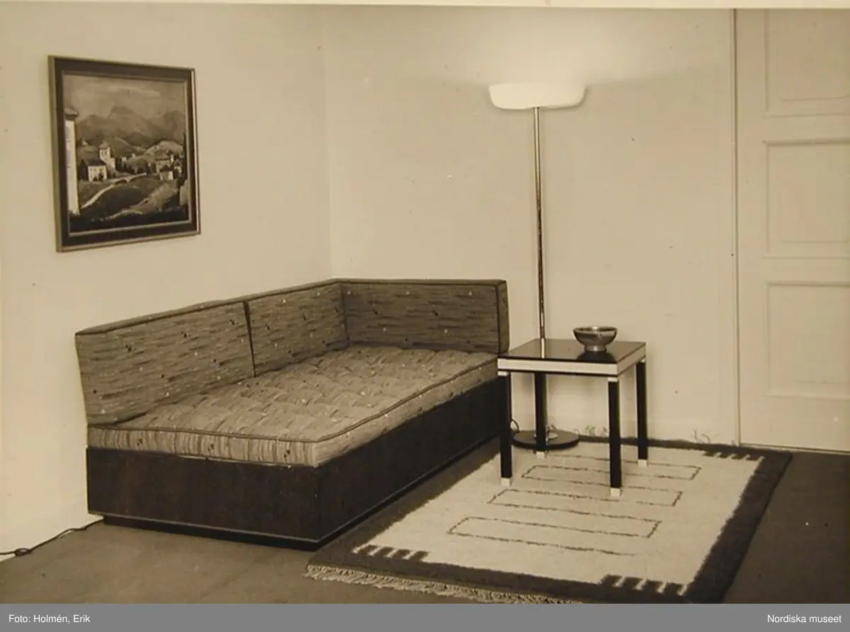 Möbelutställning på Nordiska Kompaniet 1935. Soffa, bäddsoffa. Bord modell "Corall" formgivet av Axel Einar Hjort.