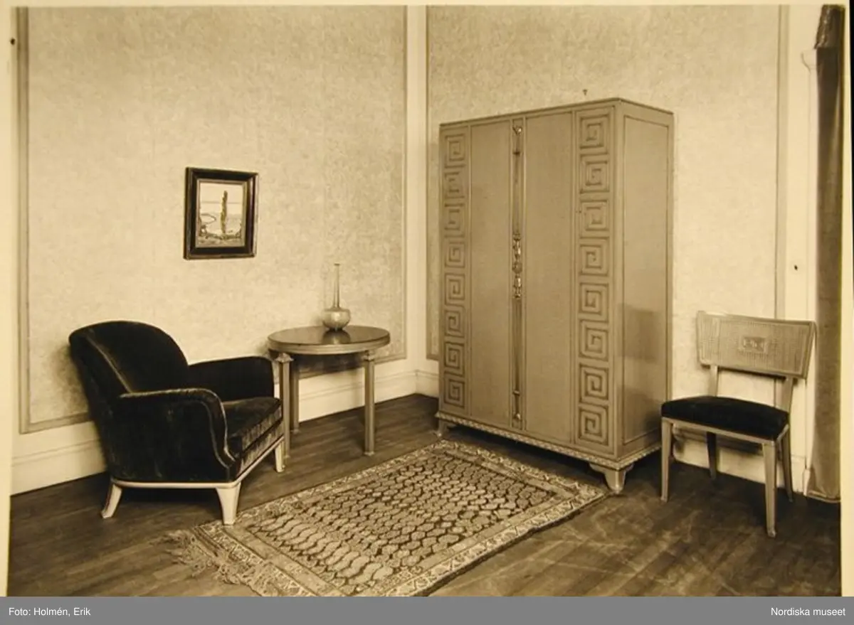 Möbelutställning på Nordiska Kompaniet 1932. Fåtölj, bord, skåp och stol i modellen "Åbo" formgiven av Axel Einar Hjort.