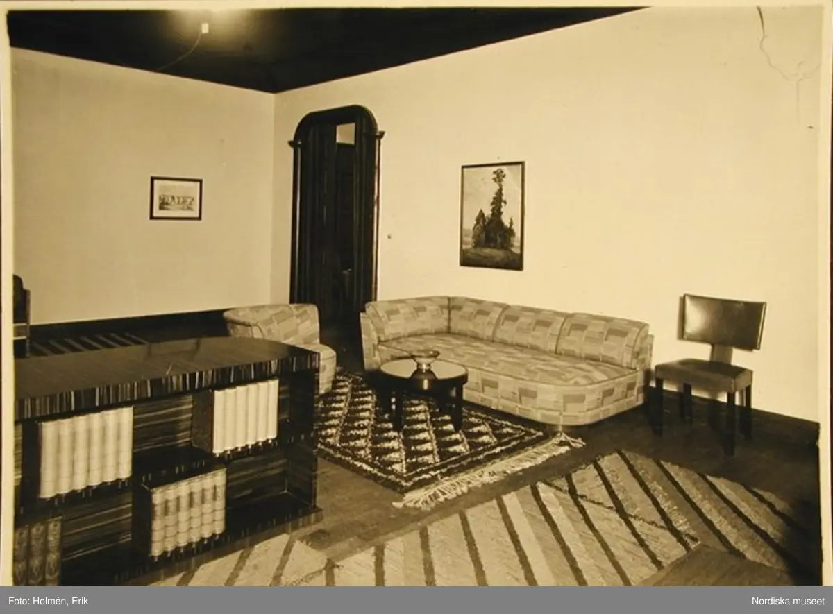 Möbelutställning på Nordiska Kompaniet 1931. Vardagsrumsmöblemang, soffa, fåtölj, stol, bord, mattor och bokhylla. Modell NK formgivet av Axel Einar Hjort.