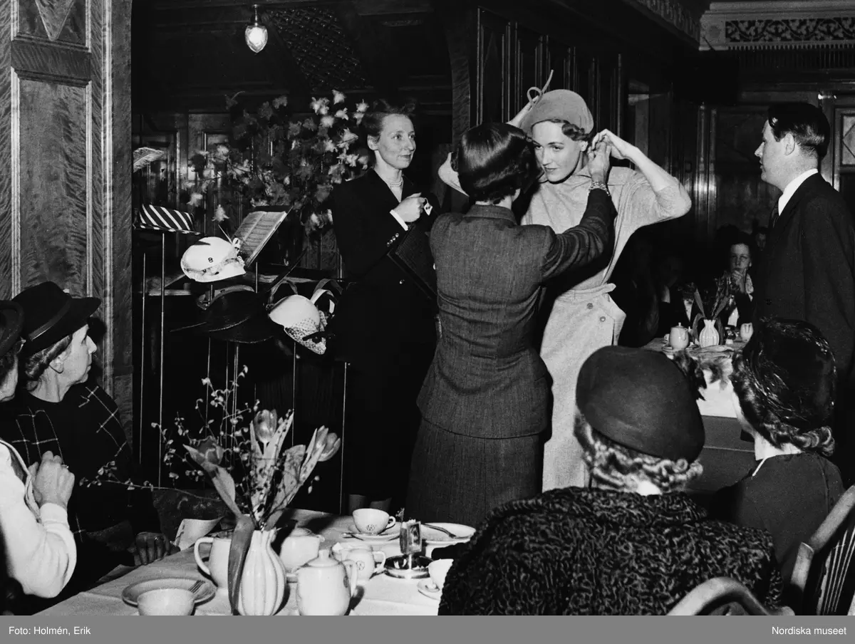 Kvinna i mörk dräkt rättar till kragen på en modell klädd i grå klänning och basker. Till vänster står en kvinna i svart dräkt och håller en handväska. Runtom sitter publik vid bord med vita dukar, NK-servis och blommor i vas. Hattar på ställningar till vänster i bilden.
