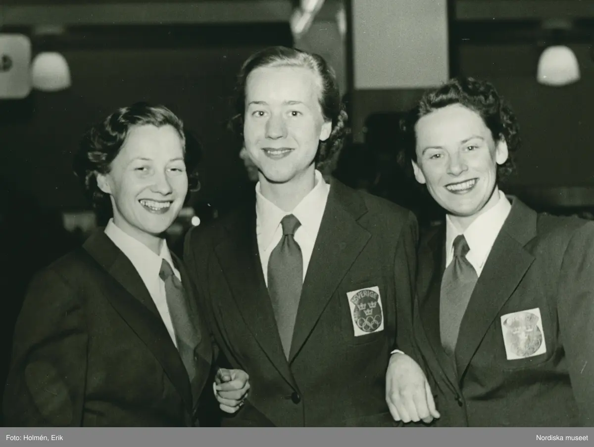 Grupporträtt av tre kvinnor i olympisk dräkt.