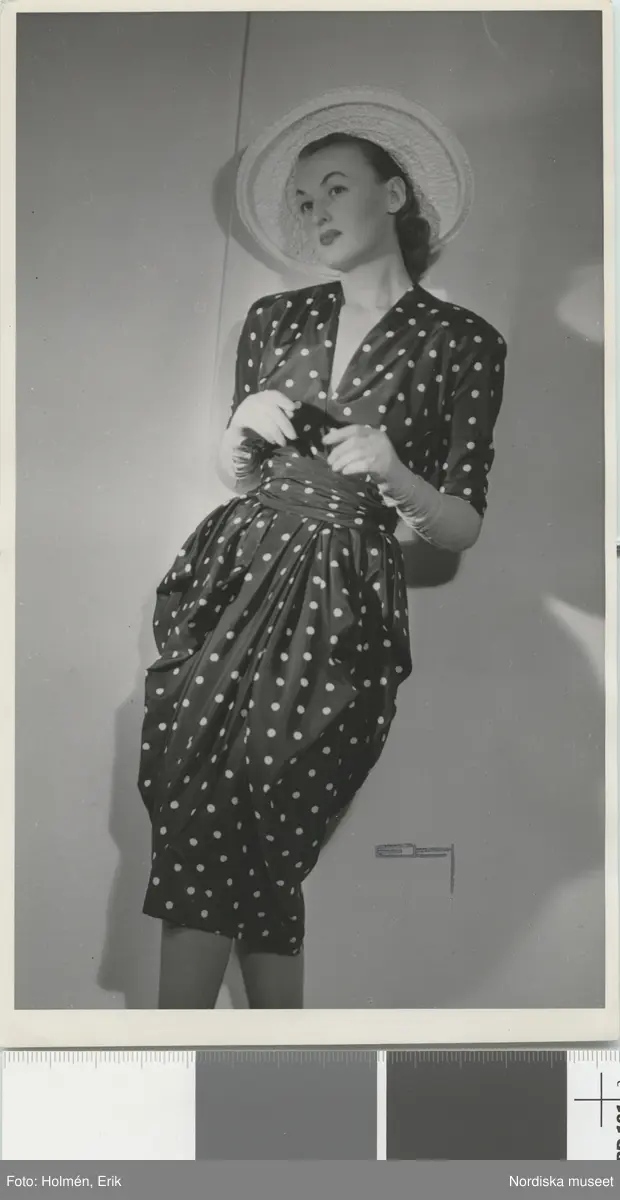 Nordiska kompaniet. Kvinna i mörk klänning med vita prickar. Trekvartsärm, ballongformad nederdel. Runt midjan ett draperat band i samma tyg. Armbågslånga ljusa handskar. Vit hatt. Text på baksidan: "Lelong uppvisning mars 1947"