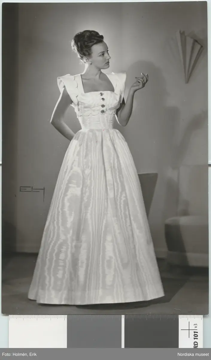Nordiska Kompaniet. Kvinna i aftonklänning av vit moaré. Text på baksidan: "Madelainevraimand" [Madelaine Vraimand].