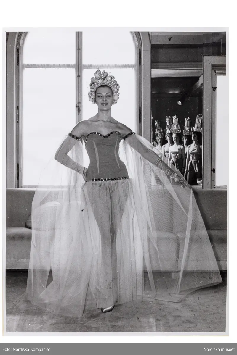 Operamaskeraden. Kvinna står framför soffa i provrum på varuhuset Nordiska Kompaniet. Hon bär peruk av kulor och maskeraddräkt med baddräktsliv, tyllkjol och tyllärmar. I en spegel syns fler maskeradklädda kvinnor.