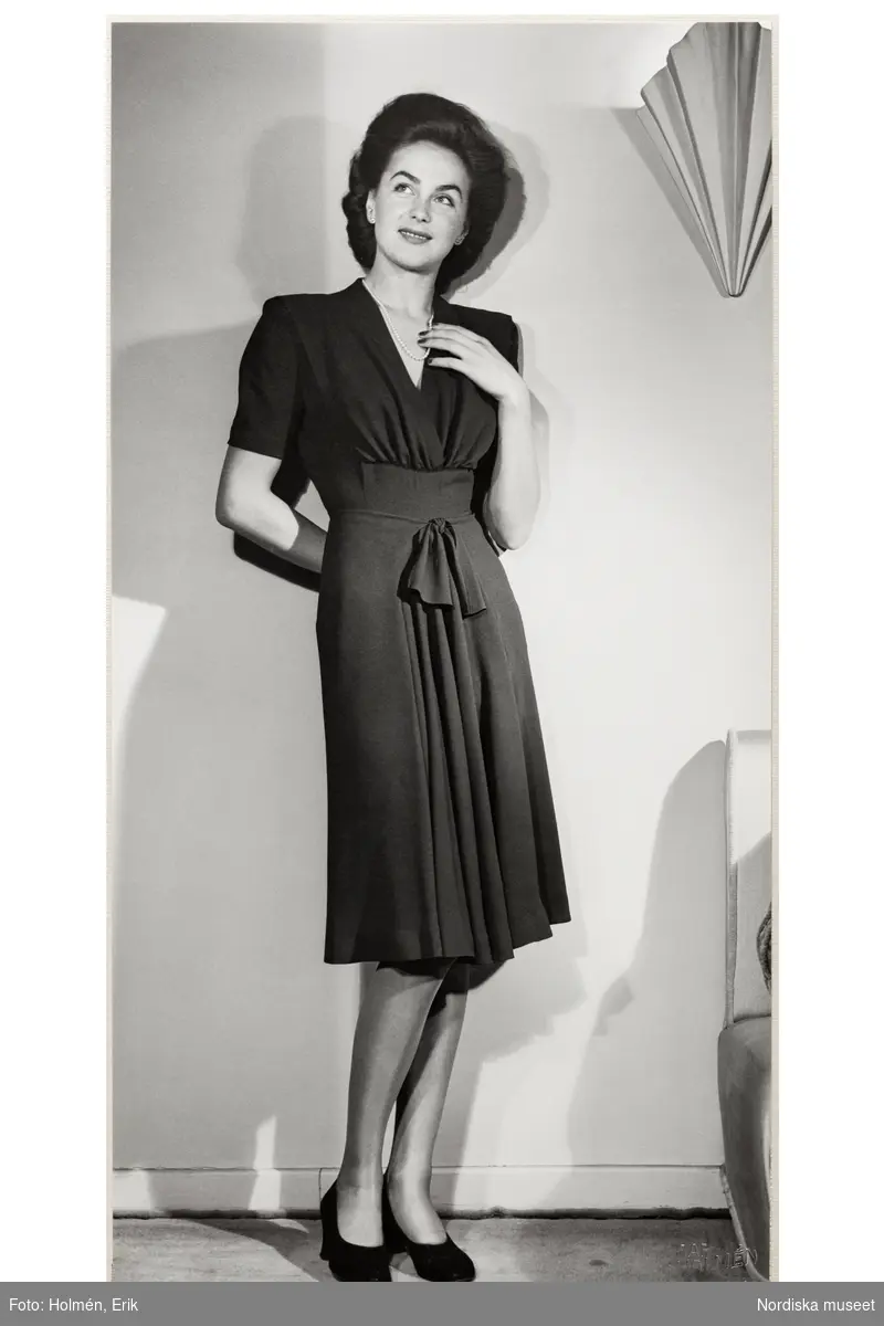 Mannekängen Hjördis Genberg poserar iklädd knälång klänning med kort ärm. Drapering vid byst och fram på kjolen samt liten rosett. Pumps med mellanhög klack. NK:s Franska damskrädderi.