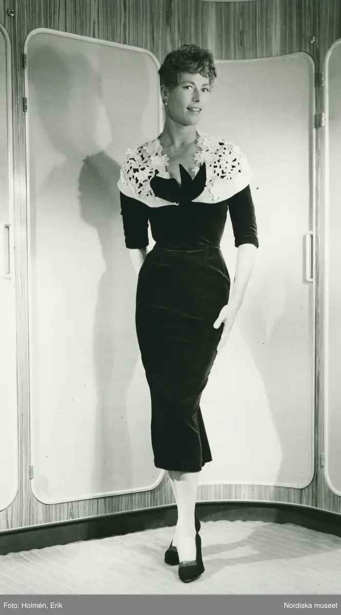 EM, Modellbutiken, Nordiska Kompaniet. Uppvisning i lunchrummet. Damkonfektion. Modell i klänning i svart sammet
