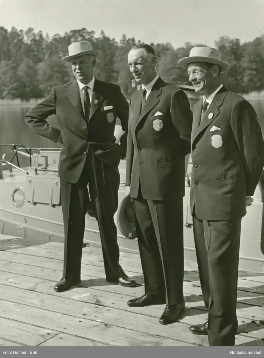 Grupporträtt av tre män i olympisk dräkt på en kaj.
