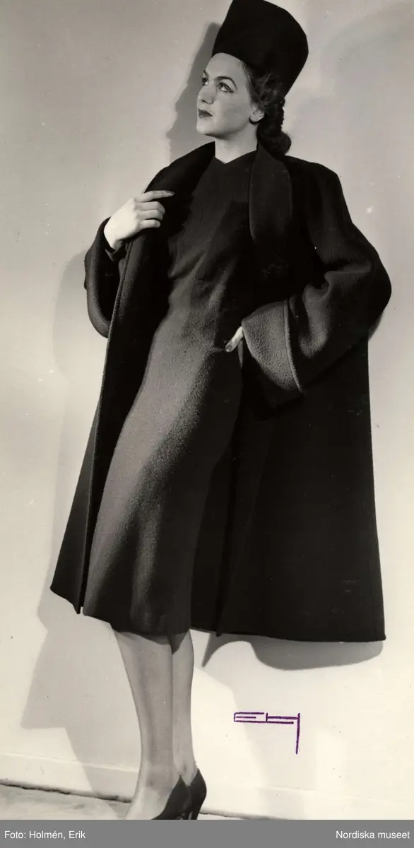 Franska avdelningen vid Nordiska Kompaniet, 1943. Kvinnlig modell poserar iklädd kappa av swaggermodell, knälång klänning, pumps och hatt.