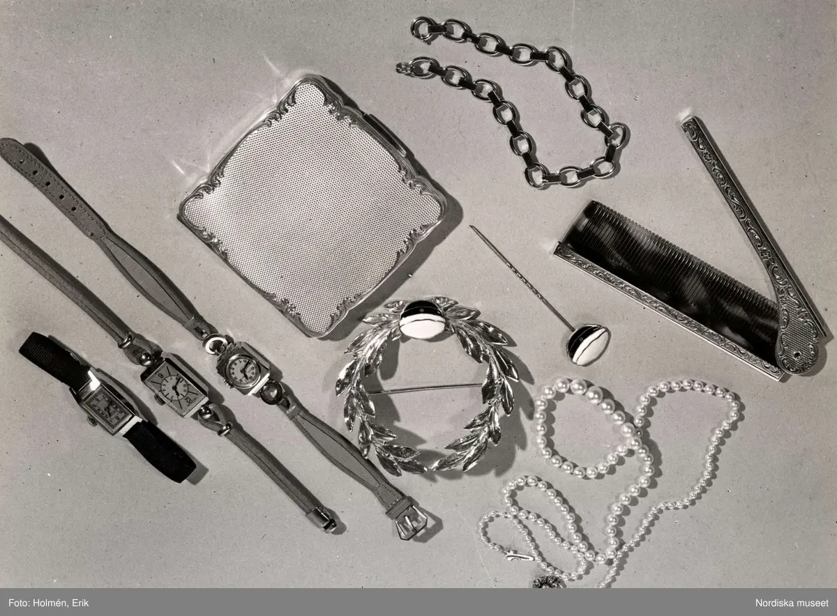 Accessoarer från Nordiska kompaniet. Armbandsur, hårnålar, puderdosa, pärlhalsband, armband och kam.