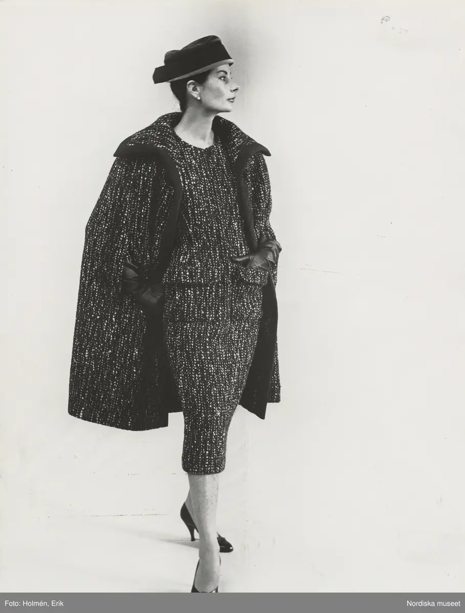 Mannekängen Erika Sundt i klänning, kappa, hatt och handskar. Original Balenciaga. NK:s Franska damskrädderi.