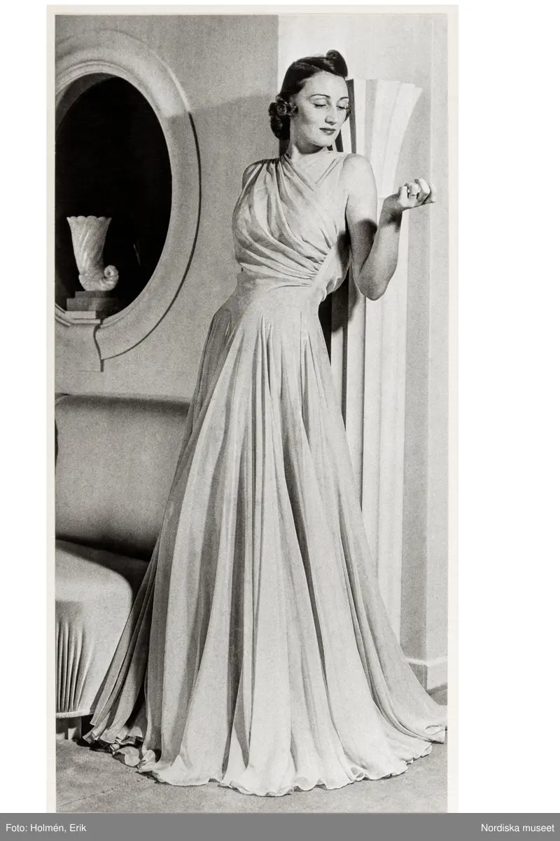 Mannekäng visar festplagg i provrum med klassicistisk dekor. Aftonklänning med omlottskuret, draperat liv, slät midja och hellång, mjukt veckad, vid kjol. NK:s Franska damskrädderi.