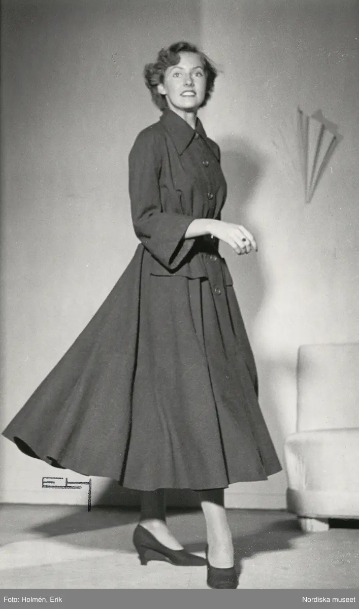 Nordiska Kompaniet. Kvinna i mörk, höghalsad klänning med vid kjol och vida ärmar. Text på baksidan: "New look Hardy Amies Höst -48"