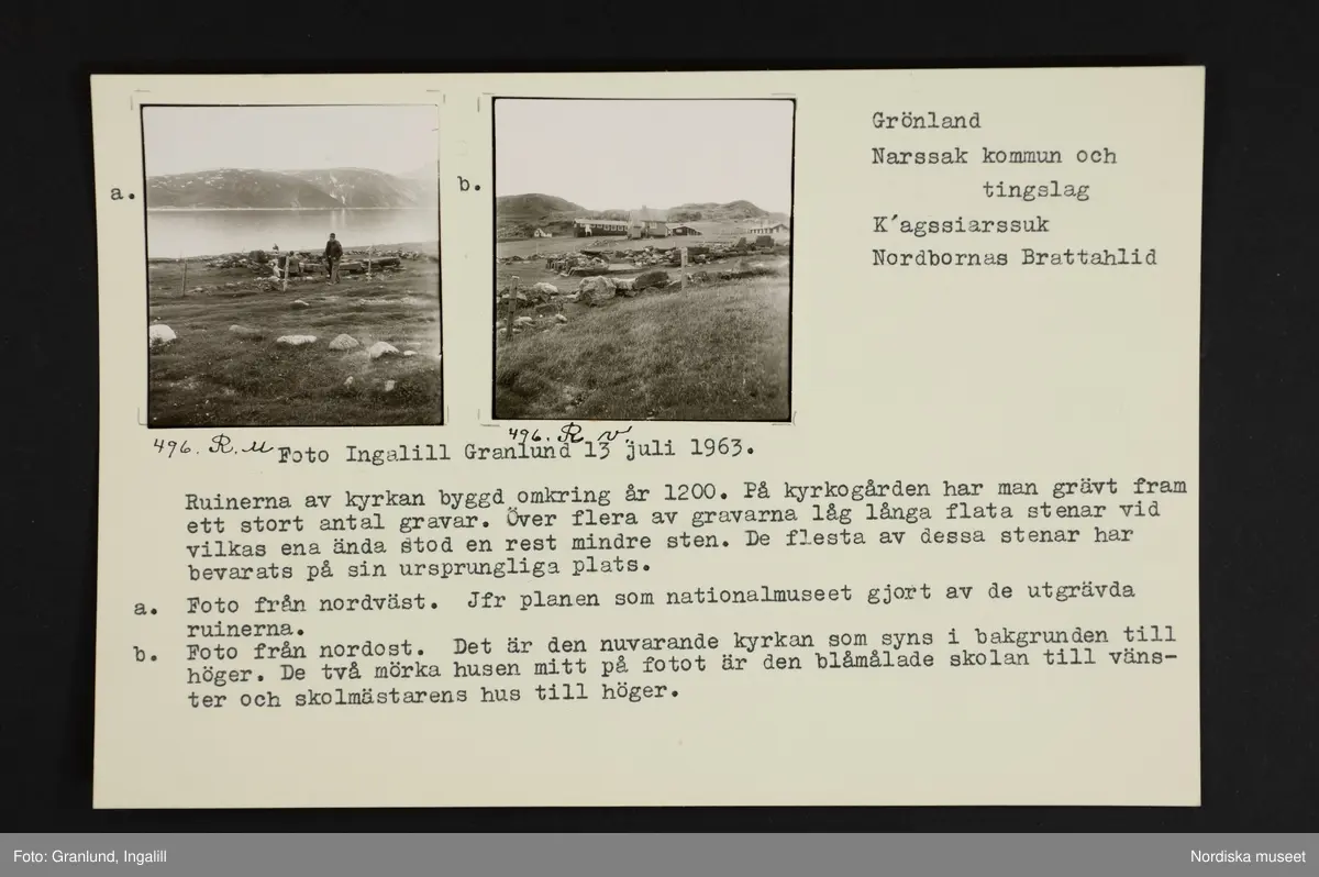 Ark med två monterade foton och text: "Ruinerna av kyrkan byggd omkring år 1200. På kyrkogården har man grävt fram ett stort antal gravar. Över flera av gravarna låg långa flata stenar vid vilkas ena ända stod en rest mindre sten. De flesta av dessa stenar har bevarats på sin ursprungliga plats.