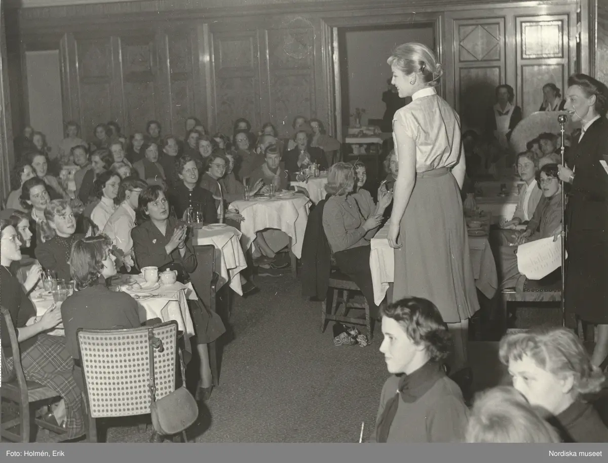 Tonårsmodevisning på Nordiska Kompaniet. Modell i blus och kjol framför sittande publik. Kvinna vid mikrofon.