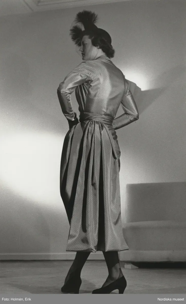 Nordiska Kompaniet. Kvinna i blank, prickmönstrad klänning. Hatt med pälsbesättning och flor. Text på baksidan: "Dior Mars 1949"