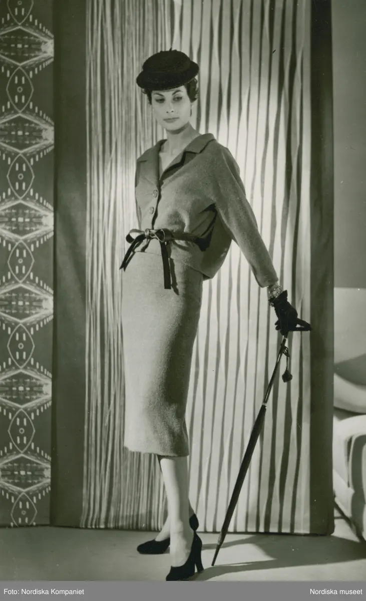 Modell i jacka med band i midjan, pennkjol, hatt, pumps och paraply i handen. Från Balenciaga. Textilier i bakgrunden.