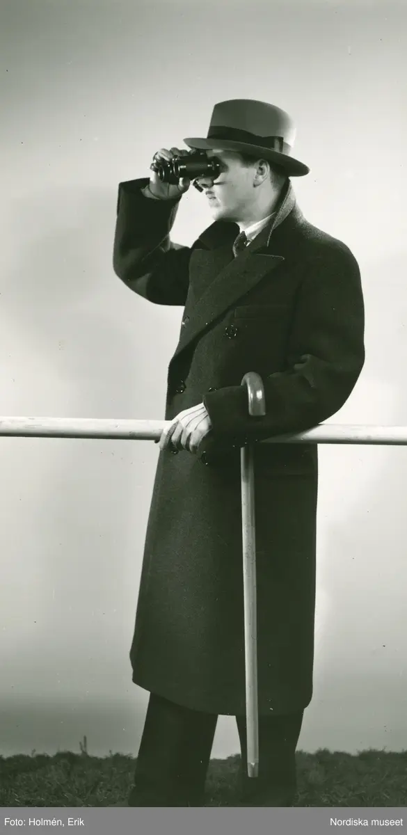 En man i kappa med hat och käpp tittar genom en kikare.