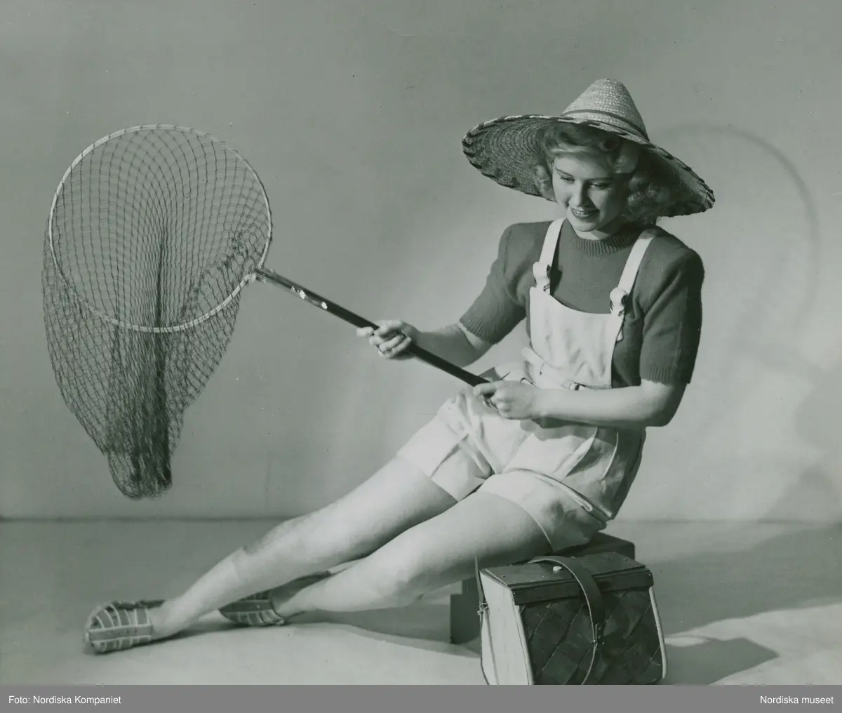 Badmode, Fru Risberg i gula velourshorts, röd jumper, stråhatt och näverväska, med en håv i handen.
