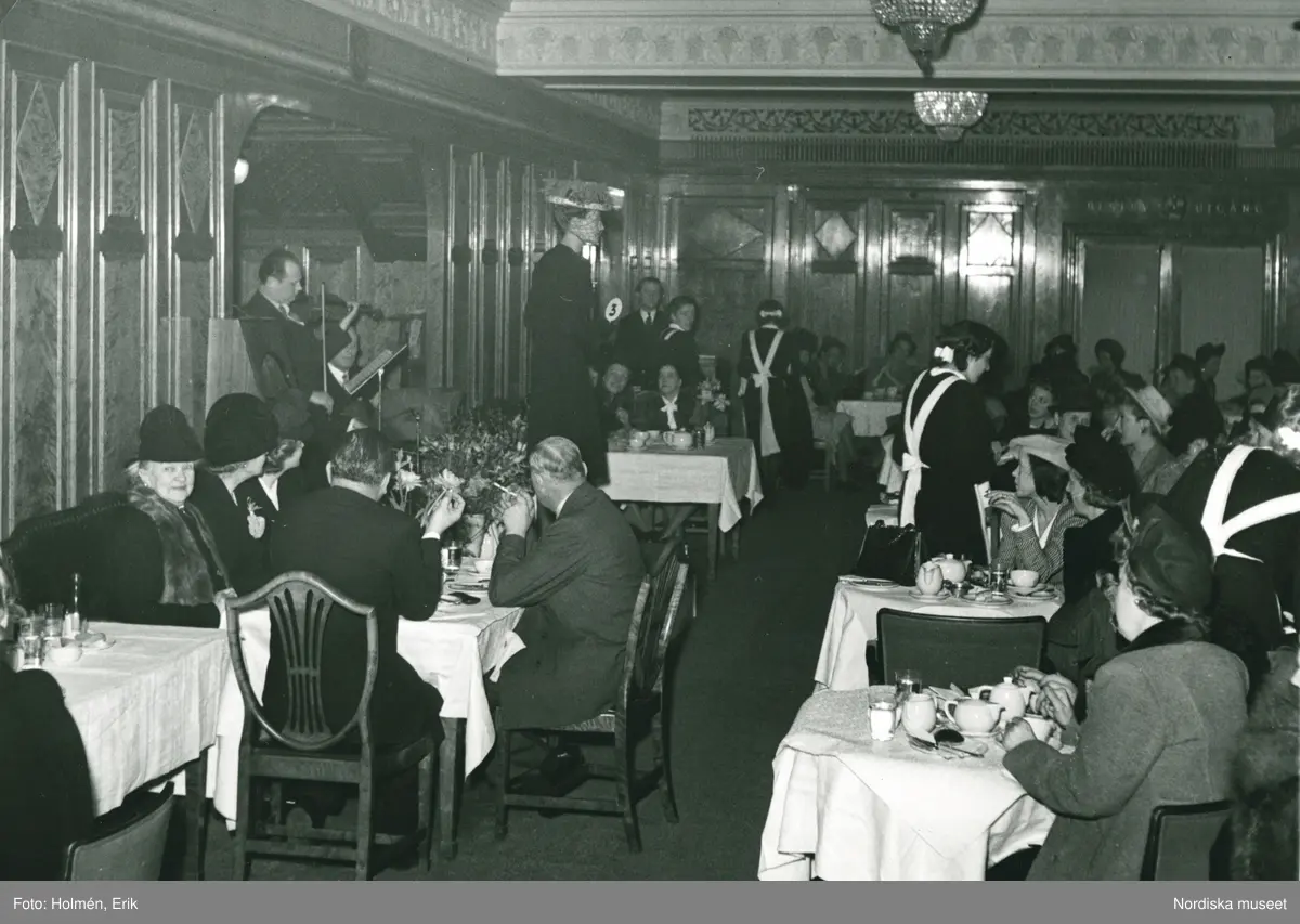 Modevisning på Nordiska Kompaniet. Modell visar hattmode. Man spelar fiol i bakgrunden. Publik sitter ned vid små bord, många bär hatt. Servitriser klädda i vita förkläden.