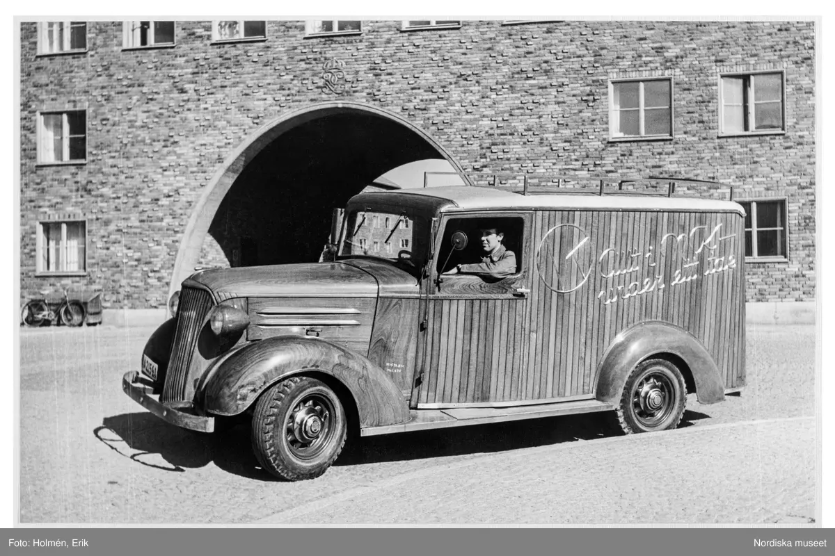 Varubil med chaufför står parkerad på gata framför tegelbyggnad med valv. På bilen står NK Allt i NK under ett tak. Så kallad paketbil från varuhuset Nordiska Kompaniet (NK) i Stockholm.