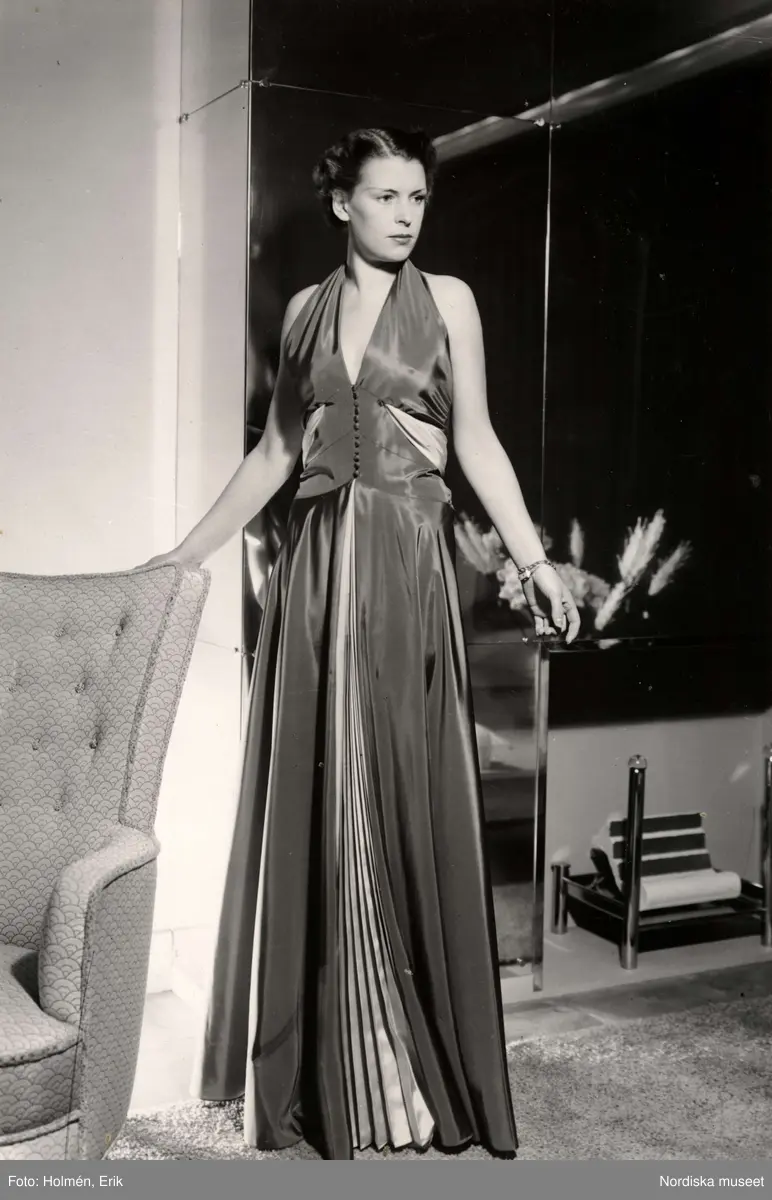 Modevisning hos varuhuset Nordiska Kompaniet i Stockholm 1936. En kvinnlig modell poserar i möblerad interiör. Hon bär en v-ringad aftonklänning med halterneck, knäppt liv och vid kjol med plisserad infällning mitt fram. Tyget är blankt och klänningens partier förefaller vara olikfärgade.