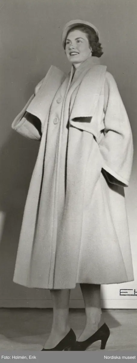 Nordiska Kompaniet. Kvinna i ljus, vid, trapetsformad, vadlång kappa med mycket vida ärmar. Två stora knappar framtill. Ljus hatt. Text på baksidan: "Hösten -49 Ch. Dior"