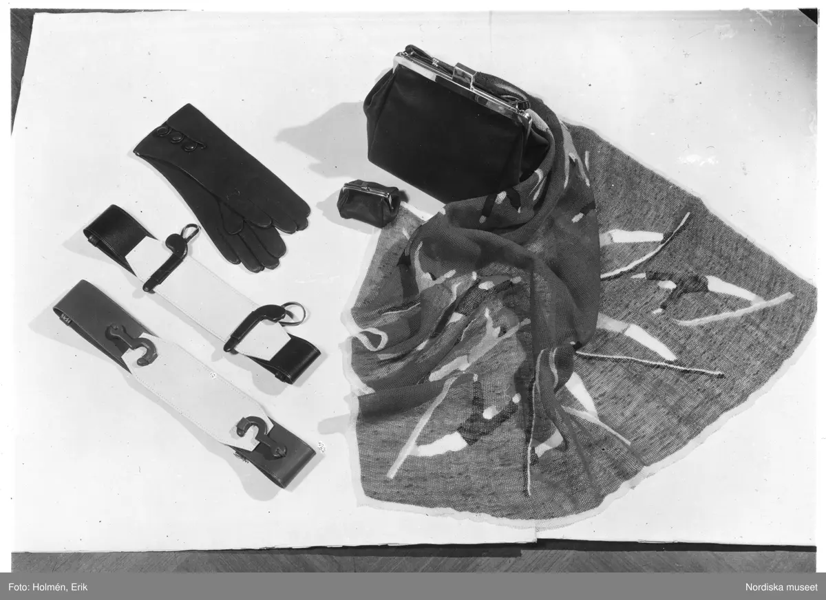 Kollage av accessoarer. Yllescarf med skidmotiv, avsedd för sport. Skinnskärp med pistoler i hölster samt hakar och hyskor. "Väskan är i nappa och visar den för säsongen karakteristiska breda botten. En lustig nyhet är portmonnän i exakt samma form som väskan."