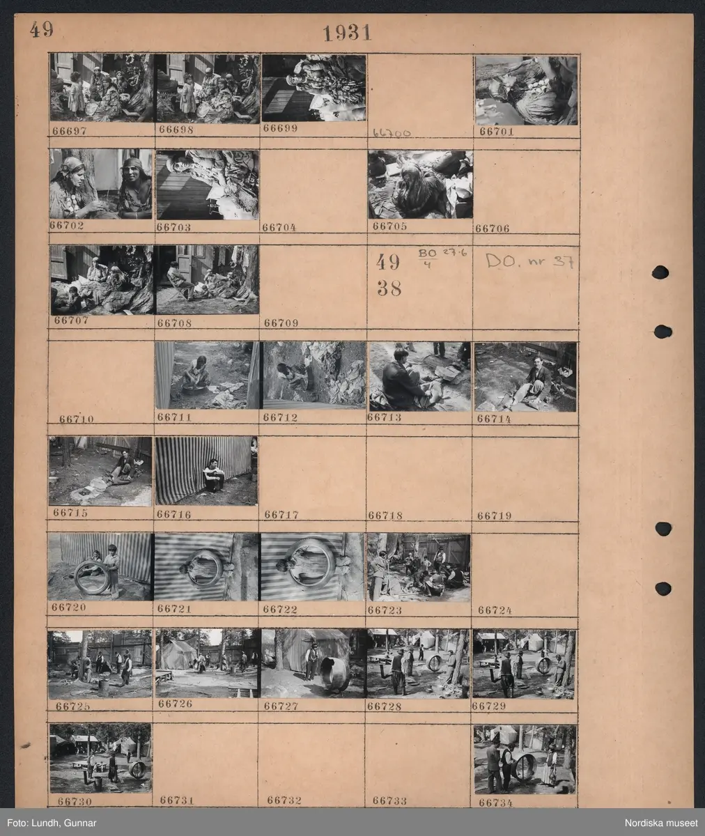 En kvinna tvättar, en man blåser luft med bälgar in i en improviserad smältugn, porträtt av en pojke med ett bildäck, vy över människor i ett tältläger.