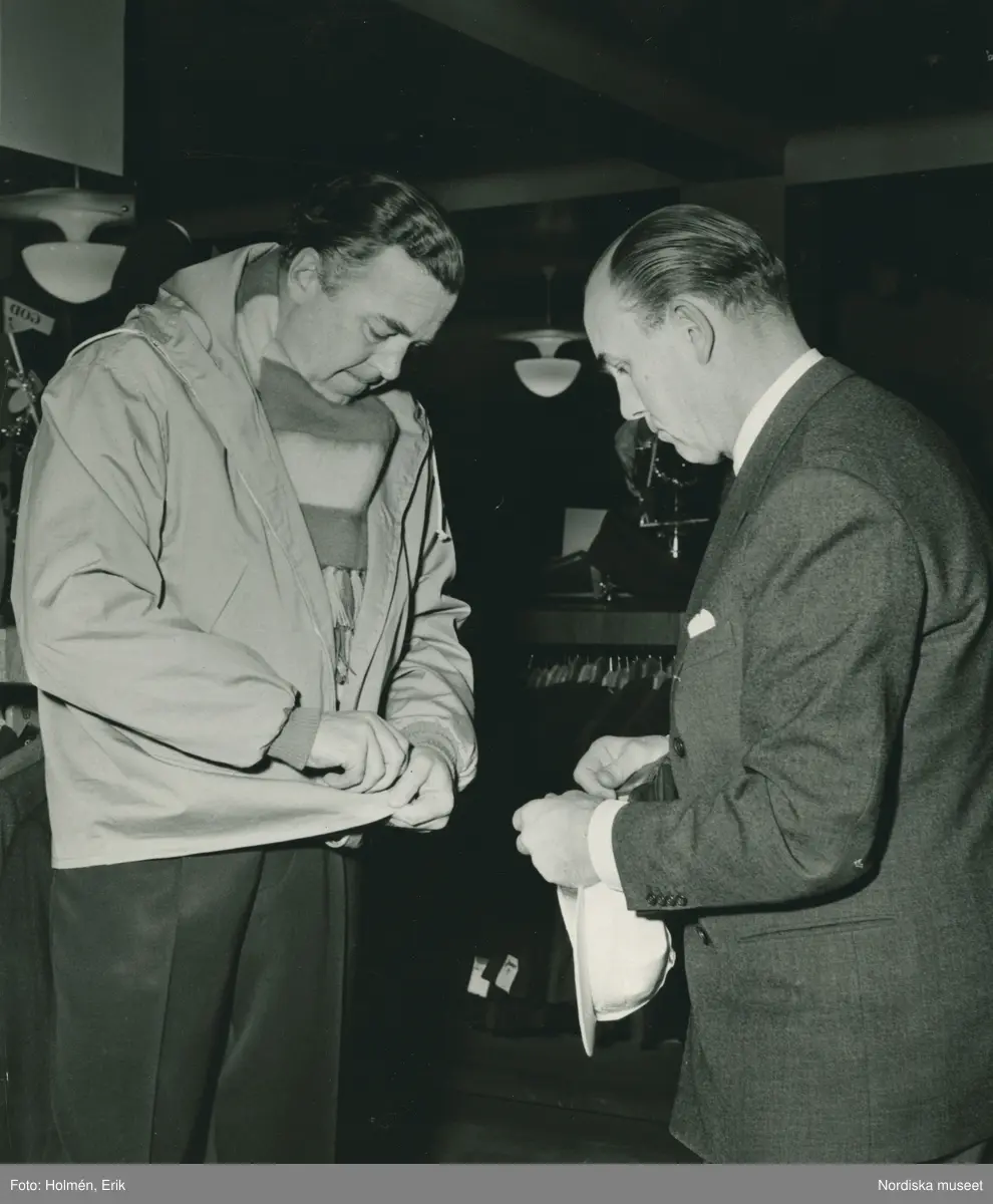 Prins Bertil tar på sig en jacka på Nordiska Kompaniets herrkonfektionsavdelning.