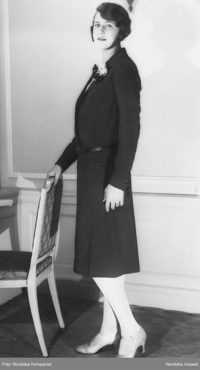 Modell i röd klänning i yllecrêpe med blomstergarnityr.