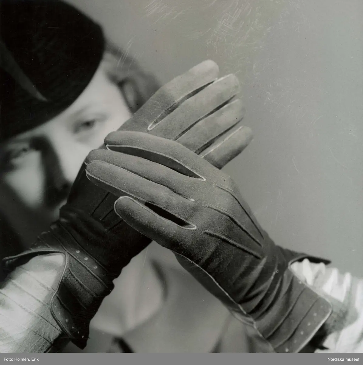 Ett par damhandskar på händer. I bakgrunden syns modellens ansikte.